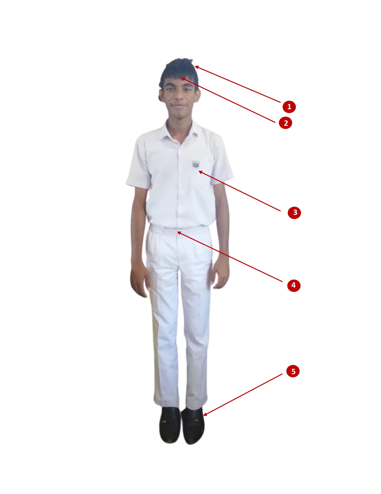 - හිස මුදුන කොටස කොණ්ඩය දිග අඟල් 2කි. හිස පැත්තේ කොටස හා මුදුන කොටස වෙන් වෙන් වශයෙන් පෙනෙන සේ නොතිබිය යුතුය.